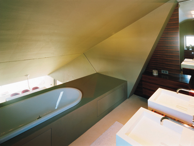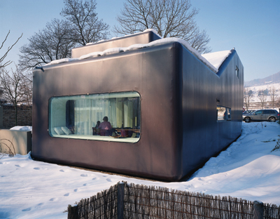 Der monolithische Baukörper besteht aus einer mit dem Hang fließenden und einer auskragenden Kubatur, mit seiner stromlinienförmigen high-tech- Haut wirkt er wie der Vorbote einer avancierten Bautechnologie, der sich in die Gegenwart verirrte. Leicht setzt das Hausobjekt auf der auskragenden Fundamentplatte auf. Sein formgebendes Traggerüst aus zerlegbaren Holzfertigteilen war in einigen Tagen aufgestellt, es lässt sich ebenso schnell abbauen. Die hinterlüftete Wärmedämmschicht ist aus recyclebarer Steinwolle, das Innere mit OSB-Platten verkleidet. Damit kein „Pappdeckelfeeling“ entsteht, kam verputzter Heraklith drauf.