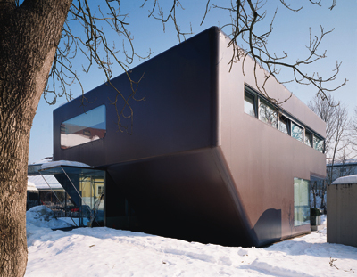 Wie sich gute Werbung zum prägnanten Bild bündelt, bringt ihre entwerferische Königsidee das Wesen des Hauses auf den Punkt: eine Wegwerfkamera, die auf Rasen fiel. Das massenkompatible Industrieprodukt reflektiert humorvoll den flexiblen Life-Style und begeisterte den Bauherrn sofort. Von braunen Kunststoffplanen überzogen, mit abgerundeten Kanten, monitorartig eingeschnittenen Fenstern wirkt es wie ein futuristisches Design-Objekt.