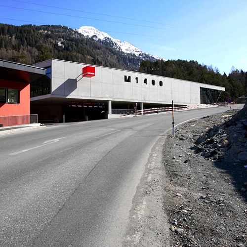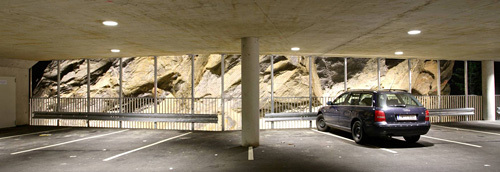Im Eingangsbereich sind Treppe und Lift situiert, die zu zwei großteils natürlich belichteten Parkgeschoßen hinunterführen. Die Parkebenen sind direkt an die Bundesstraße angebunden, eine Rampe führt ein Halbgeschoß hinauf und erschließt die erste Ebene. Eine Wendelrampe im Süden führt in das zweite Tiefgeschoß, die Ausfahrt wiederum um ein Halbgeschoß nach oben zurück auf das Niveau der Bundesstraße. Im nördlichen Bereich sind die gedeckte Anlieferung mit Laderampe und Nachtlager situiert.