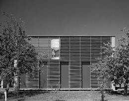 Es führt im Erdgeschoss als plastischer Körper die Wege um sich herum, schirmt eine zum Garten hin offene, weit ins Volumen hineingeschnittene NW-Terrasse vom Wohn-Eßbereich ab und definiert einen lichtdurchfluteten Luftraum als Zentrum des Obergeschosses. (Text: Otto Kapfinger in „Baukunst in Vorarlberg seit 1980, Hrsg. VAI / KUB“)