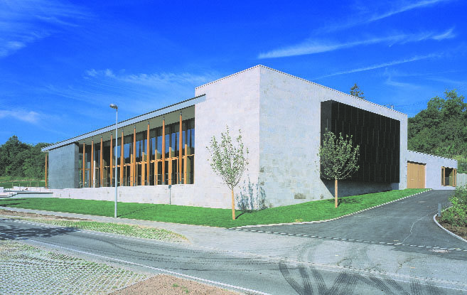 Der Zugang zur Festhalle erfolgt – fußläufig von Weissach und von der Parkplatzanlage kommend – auf der Südseite. Ein westlich des Haupteingangs gelegener Hof erschließt die dienenden Räume der Festhalle. Auch die Kegelbahnen und die Gaststätte werden hierüber erschlossen. Der Anlieferverkehr erfolgt im nördlichen Grundstücksbereich, so dass Überschneidungen von Anliefer- und Besucherverkehr vermieden wurden. Der Gebäudekomplex der Festhalle setzt sich aus zwei Einheiten zusammen. Die Festhalle wurde als eigenständiges Volumen parallel zur Straße positioniert. Das weit auskragende, flache Dach überspannt den Saal und das Foyer und bildet mit seinen Überständen großzügig überdachte Außenbereiche, die ganz selbstverständlich zum Verweilen einladen. Die Fassaden von Foyer und Saal werden durch große Glasflächen zur Landschaft geöffnet. Dem Saal wurde eine »Stadtloggia« vorgelagert, die durch das weite Dach und filigrane Vollholzstützen gebildet wird – eine Austrittsmöglichkeit für die Festhalle, ein Ort der Kommunikation, Archetypus der »res publica«. Das Volumen der Bühne wurde, im Gegensatz zur leichten Dachkonstruktion des Saales, als Massivbaukörper ausgeformt und bildet gewissermaßen das Rückgrat der Komposition. Zudem wurde mit diesem Bauteil eine eindeutige Raumkante entlang des nicht bestimmbaren, nachbarschaftlichen Sammelsuriums geschaffen.