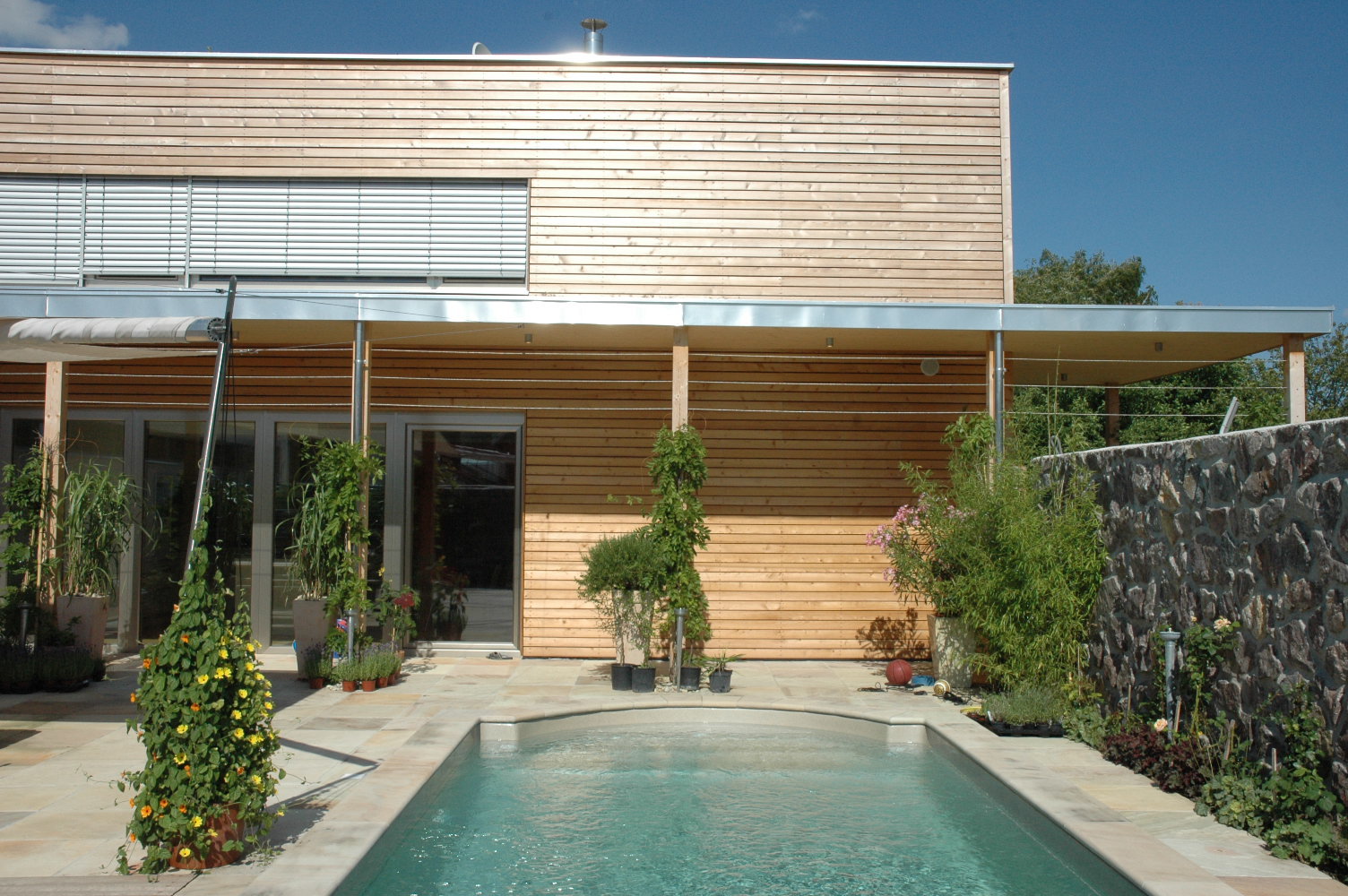 Reduziert, klar und einfach ist die Aussenwirkung. Wohnhaus, Nebengebäude und Hofmauer umschliessen einen geschützten Innenhof. Die wesentlichen Räume sind zum Innenhof orientiert und schaffen dadurch einen geschützten privaten und ungestörten Bereich. Statt dem Keller sind Nebenräume wie Garage, Lager, Wirtschaftsraum, Speis ebenerdig im Nebengebäude bzw. Hauptgebäude situiert.