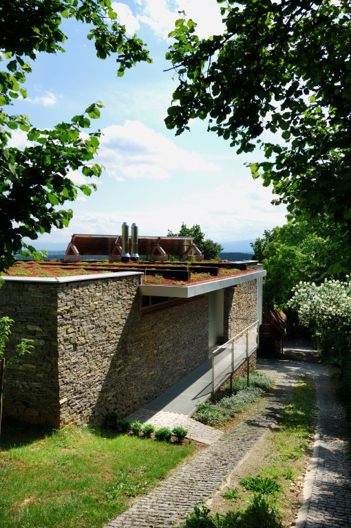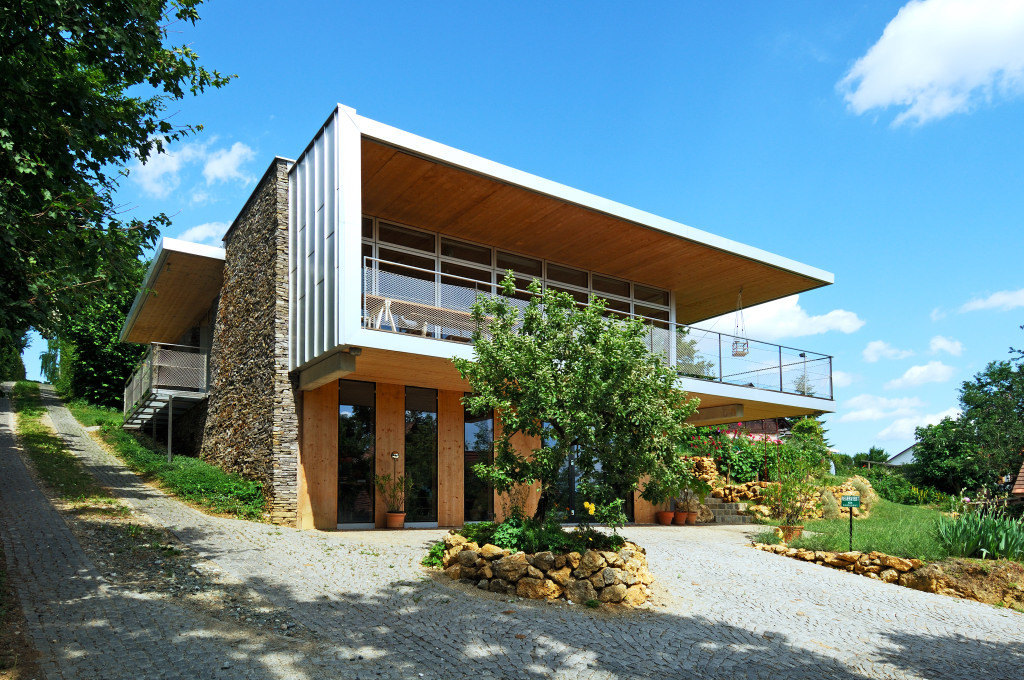 Die Entwurfsparameter waren, auf dem begrenzten Bauplatz ein zur Zufahrtsstraße möglichst geschlossenes und zur Landschaft und zur Sonne hin offenes Wohnhaus zu schaffen. Weiters sollte es zu keinen Beeinträchtigungen des oberen Nachbarn kommen und dessen Fernblick noch unterstützen.Wenige Materilalien sollten das äußere Bild des Gebäudes bestimmen: Im erdberührten Kellerbereich Stahlbeton, ab der Mauerkrone Kellerwände sollte Holz und für die Fassaden Glas und Natursteinmauerwerk eingesetzt werden.