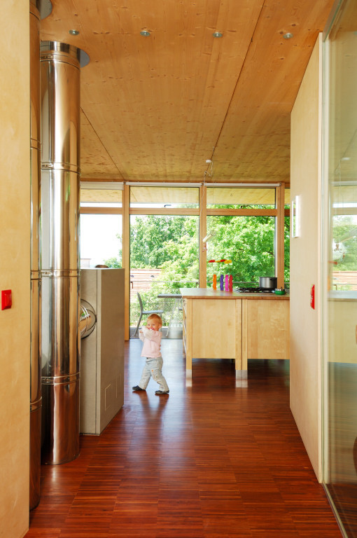 Ein Pelletsheizkessel mit 10KW Leistung und eine in allen Wohnräumen verlegte Fußbodenheizung übernehmen die Hauptlast der notwendigen Raumheizung. Der Kachelofen im Wohnzimmer dient zur Spitzenabdeckung und fungiert die übrige Zeit als stimmungsvolles Heizmöbel. Die Warmwasserbereitung wird durch eine Solaranlage bewerkstelligt. (Text: Armin Ibounigg)