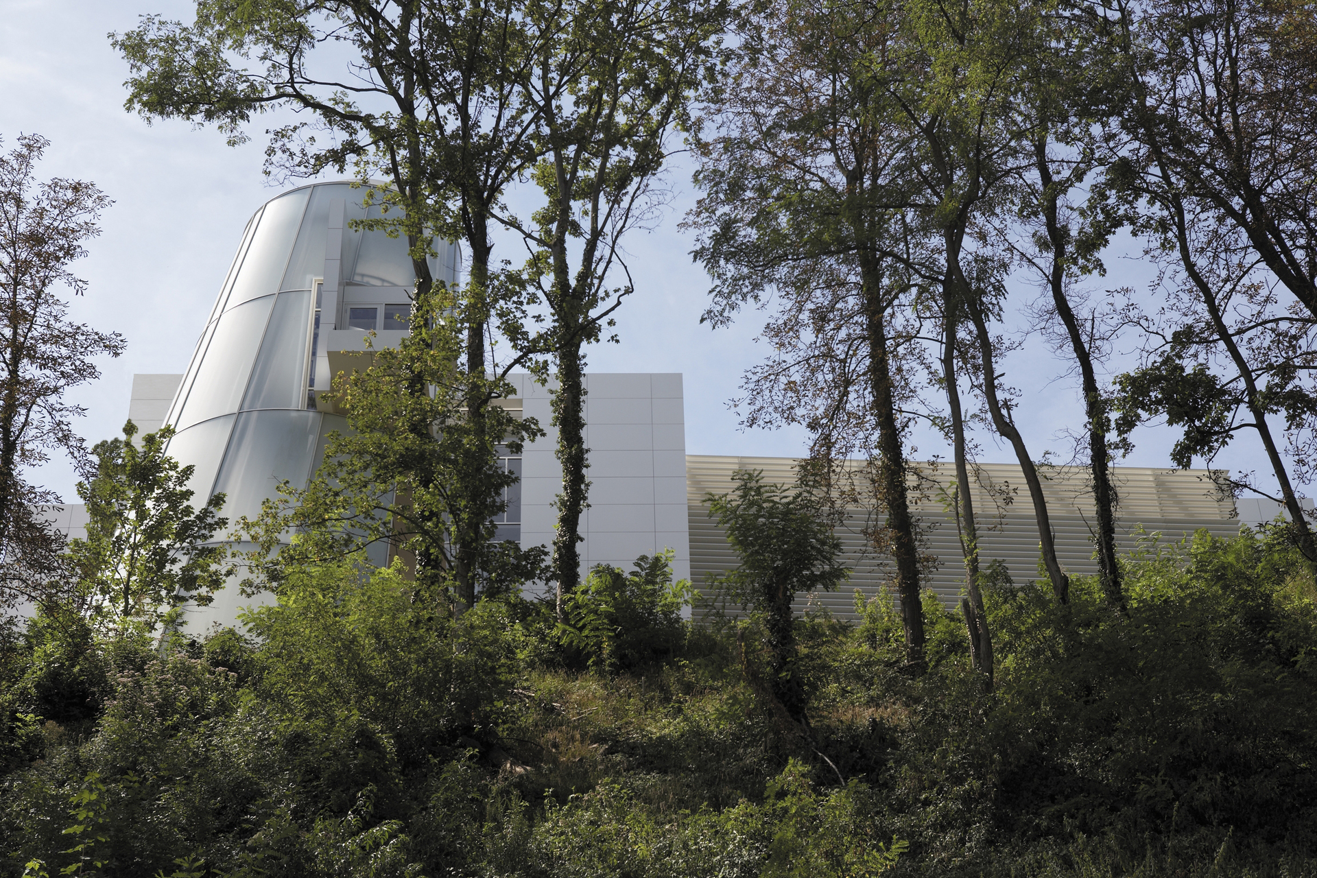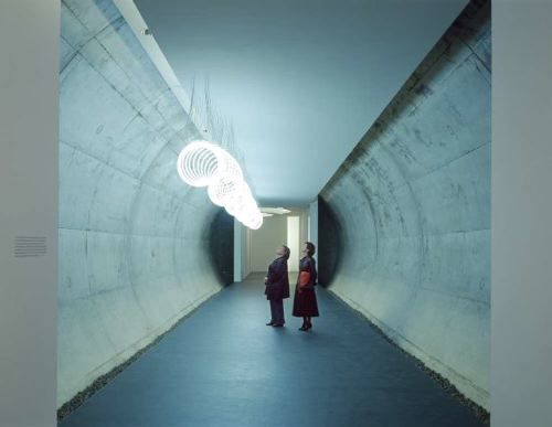 Der Eingang zum Museum, in welchem Werke von Hans Arp immer wieder neu mit zeitgenössischer Kunst konfrontiert werden sollen, befindet sich im Bahnhofsgebäude. Dort geht es hinab zu einem vierzig Meter langen Tunnel, der unter den Bahngleisen hindurch zu einem verglasten Konus führt, von wo zwei Aufzüge die Besucher vierzig Meter hinauf zum Museumsneubau befördern. Dieser ist ganz in Meiers bekannter Sprache gehalten und bietet deshalb keine architektonischen Überraschungen. Allenthalben flutet Helligkeit durch Glasfassaden und Oberlichter. Nur auf der Arp gewidmeten Beletage gibt es ein abgeschirmtes Kabinett für kleinere Arbeiten. Sonst aber wirken die Gouachen, Collagen, Ölbilder und Reliefs des elsässischen Dadaisten in den elf Meter hohen, durch Blickachsen erschlossenen Räumen und loftartigen Ausstellungsplattformen reichlich verloren.