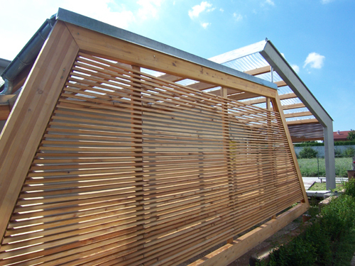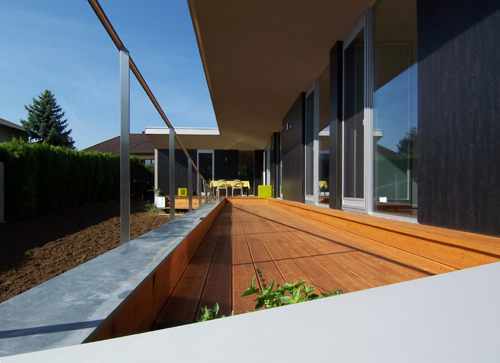 Die Bodenplatte und alle tragenden Wände sind aus Kreuzlagenholz. Die Dämmung montierten die Bauherren selbst, anschließend wurde grau verputzt. Auch die Lattenroste des Carports stellten sie selbst auf. In der Nordwestflanke schlüpft man direkt zum Eingang. Hier liegen die Nebenräume, alle anderen Zimmer fassen winkelförmig den Garten ein. „Das Haus ist nach außen introvertiert und nach innen extrovertiert“, erklärt der Architekt. „Die Terrasse ist der Übergang. Je nach dem, wo man steht, gehört sie zum Freien oder zum Haus.“