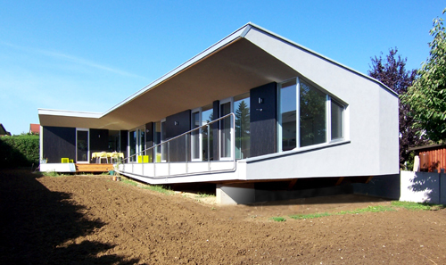 Das Budget war knapp. Gewünscht war ein Niedrigenergiehaus mit einem Keller und einem Arbeitsstudio für die Baufrau. Das traf sich gut, denn der Grund fällt über seine Gesamtlänge um 1,40 Meter ab. „Ganz eben konnte man das Haus ohnehin nicht hinstellen, man musste mit dem Hang arbeiten.“ Leichtfüßig gleitet es auf einem Streifenfundament den Garten entlang, wo es am Ende über dem Keller entschwebt. Im Eckfenster des Schlafzimmers zeigt sich bei Sonnenaufgang der Kogelberg in bestem Licht.