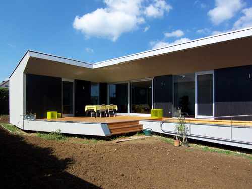 Hinter einer schönen Fassade aus Glas und rauchgrauen, furnierten Max-Platten sind am Garten Wohn-, Kinder- und Schlafzimmer aufgefädelt. Unter dem ansteigenden Dach streben sie der Sonne entgegen. Weit ragt es über die Terrasse, die sich vom Pflanztrog am Schlafzimmer bis zu ihrem dicken Ende vor den Glastüren des Studios ergießt. Übrigens: Der offene Wohnraum umfasst auch die Küche. Oberschränke gibt es nicht, dafür rahmt ein Abstellbord die Fensterkante und hält so den Blick nach außen frei. Die Baufrau schwärmt: „Die Lichtspiele der Lamellen sind toll, vor allem am Vormittag. Im Winter reicht die Sonne bis ganz nach hinten.“