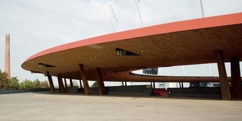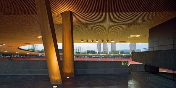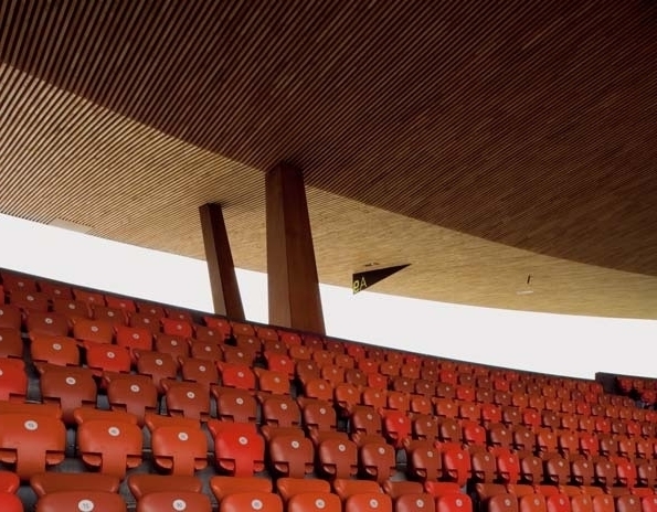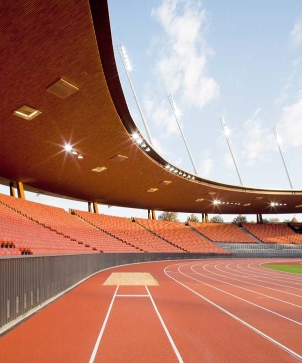 Die Form des Stadions ist aufgrund der Leichtathletikanlagen und der Sehwinkel der Zuschauer entstanden. Wie reflektiert die gewählte Geometrie Schall und Klang?