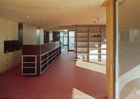 Bis auf zwei speichermassenwirksame Betonscheiben handelt es sich beim Neubau um ein reines Holzhaus in Niedrigenergie-Bauweise. „Im Vergleich zu Beton oder Stahl ist Holz ein vergängliches Material, bei dem klar ist, dass es eines Tages ausgetauscht werden muss“, sagt Irene Antel, „Holz ist ganz einfach lebendig.“ Und genau das sei das Schöne daran. „Wir wollten zeigen, dass man mit Holz nicht nur rustikal, sondern auch modern und zeitgemäß bauen kann.“ Vom roten Holz-estrich bis zur massiven und sichtbar belassenen Kreuzlagensperrholzdecke ist das Haus eine durchkomponierte Sinfonie an Holzwerkstoffen. Außen ist es mit unbehandelten Lärchenlatten verkleidet, die mit der Zeit grau werden. Innen sind die installationsführenden Holzständerwände mit OSB-Platten und mit Fichte beplankt. Und sogar die Möbel sind aus Holz: Sie bestehen teilweise aus furniertem Sperrholz, teilweise aus massiver Fichte.
