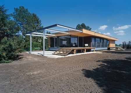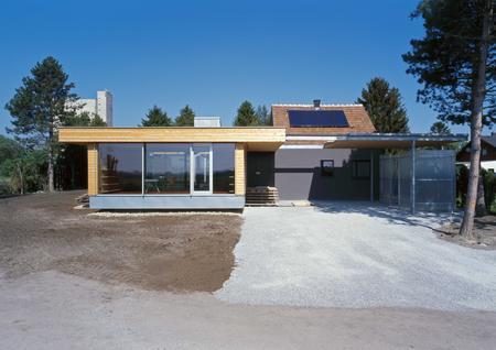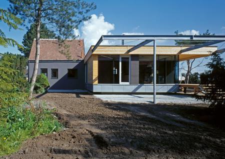 Wo die Aulandschaft der Fischa ins Wiener Becken übergeht, entdeckten die beiden Antels ein unaufregendes, aber schön gelegenes Häuschen aus den Fünfzigerjahren. Sie entschieden sich zum Kauf und beschlossen, das Gebäude für ihre Zwecke zu erweitern. Hier konnten sie zeigen, wie sich ökologisch nachhaltig im Einklang mit Natur und Bestand wohnen und arbeiten lässt - ein perfektes erstes Referenz-Projekt. Eines wusste man von Anfang an: Das Architektenhaus sollte nicht protzen. Mehr als ein Geschoß kam für das eigene Wohn- und Arbeitsparadies daher nicht infrage.