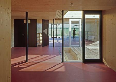 Den Altbau betrachteten Antel und Antel als bestehende Raumressource. Er blieb, wo er war und birgt nun Lager, Archiv und Haustechnik. Als stiller Zeitzeuge regionalen Bauens bildet er heute die integrative Mitte des Neubaus. Da man sich hier mitten im Überschwemmungsgebiet befindet, musste dafür Sorge getragen werden, dass man auch dann trocken über dem Gelände schwebt, wenn die Fischa wieder einmal aus den Ufern tritt. Daher wurde der Neubau aufgeständert: Sechs Stufen führen auf das erhöhte Betonfundament hinauf.