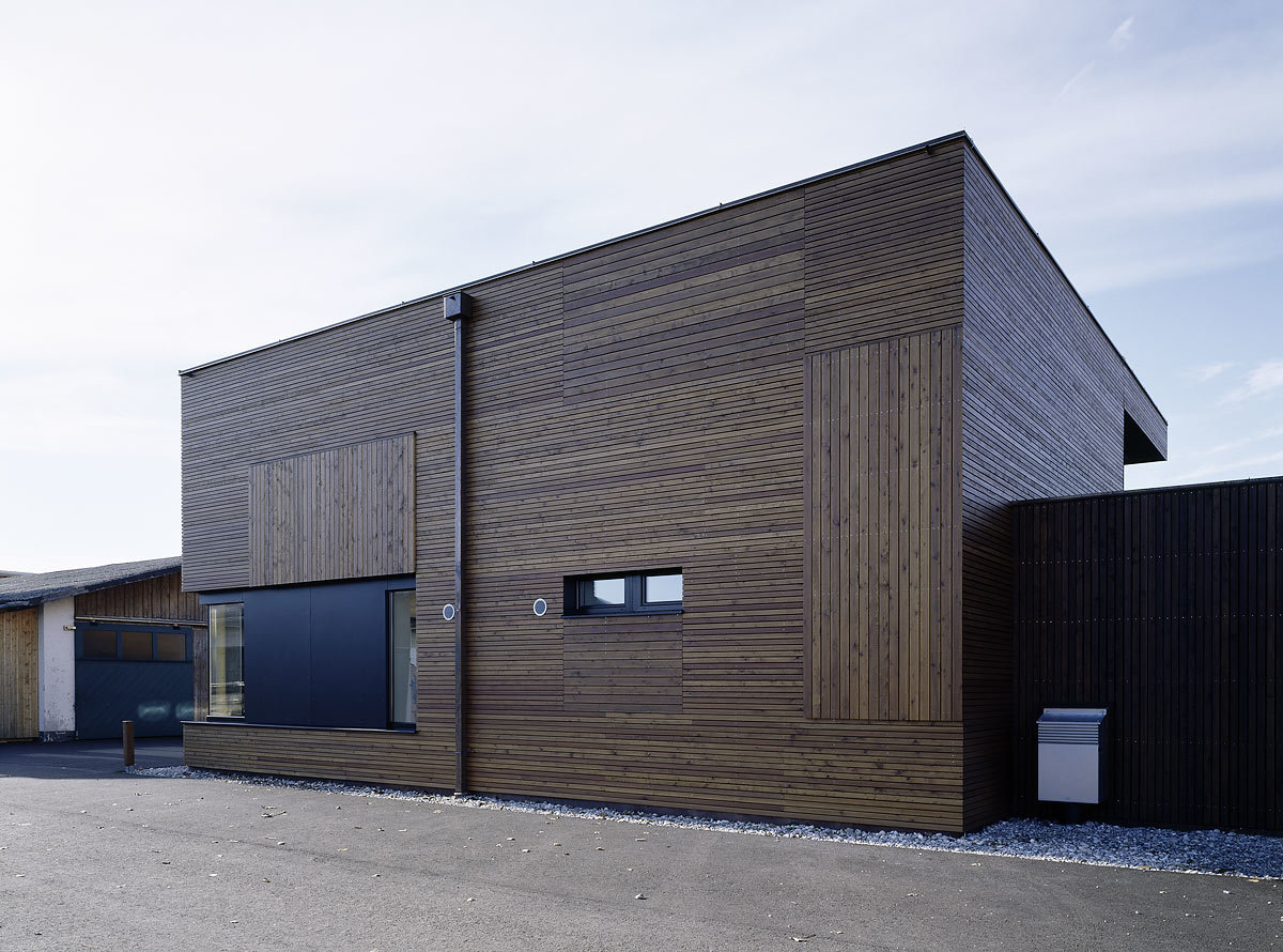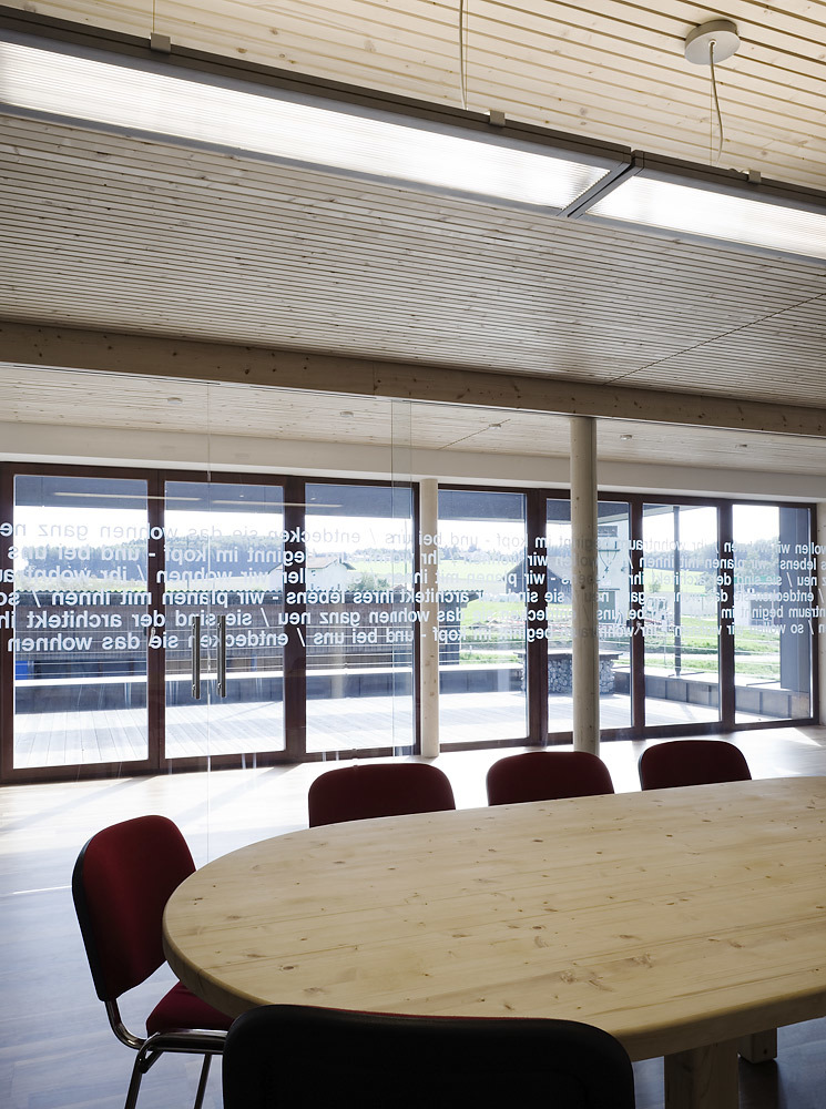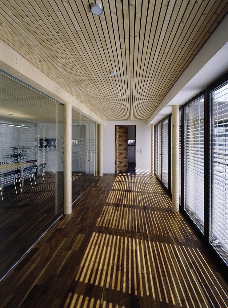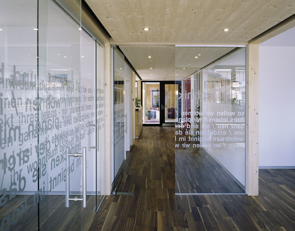 Das neue Büro- und Kundengebäude des Holzbauunternehmens gesellt sich einem älteren Demonstrationsbau zu, geht diesem jedoch punkto zeitgemäßer Technik und Formensprache weit voraus. Bezüglich Maßstab und Wohnlichkeit ist es, obwohl Bürohaus, Versprechen und Garant für die Vertrauen suchende private Auftraggeberschaft. Der Bau macht innen wie außen sichtbar was das Unternehmen über seine reflektierte Holzbauerfahrung durch die Jahre hinweg entwickelt und verbessert hat. Die Passivhaustechnik (Energiekennzahl 8 KWST/ Jahr – und dies trotz Dachterrasse!) hat in der Technologie des Hausbaues und seinen Details Ausdruck gefunden. In der äußeren Erscheinung ist das Haus Schaustück und Logo zugleich. An der Rückseite werden Schalungsmuster demonstriert. Das die Eingangsfassade beherrschende „Z“ steht als Kurzform für den Firmennamen. Ein mittelgroßes Holzbauunternehmen hat die Notwendigkeiten der Zeit erkannt und sich der Architektur, der Zusammenarbeit und einer zeitgemäßen Selbstdarstellung geöffnet. OÖ Holzbaupreis 2007