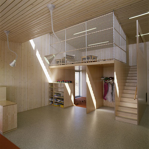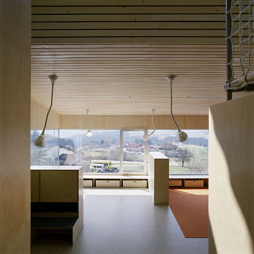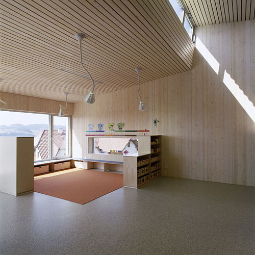 Das Budget, mit dem die Architekten den Zubau zu realisieren hatten, betrug weniger als die Hälfte der für ähnliche Aufgaben üblicherweise bewilligten Mittel. Aber auch der Bauplatz sowie Lage und Ausformung des Bestands stellten massive Einschränkungen für das Projekt dar. Auf das Wesentliche der Aufgabe konzentriert, schufen Schneider & Lengauer trotzdem einen großzügigen, den pädagogischen Richtlinien entsprechenden Gruppenraum, der den Kindergarten um mehr als nur die gewonnenen Flächen bereichert. Für den Baustoff Holz sprachen nicht nur seine besondere Eignung zur Vorfertigung und die damit verbundene Bauzeitverkürzung, sondern auch seine optischen, akustischen und haptischen Qualitäten, die Schneider & Lengauer einsetzten, um die Architektur mit Begriffen wie Naturverbundenheit, Wärme und Geborgenheit zu verknüpfen.