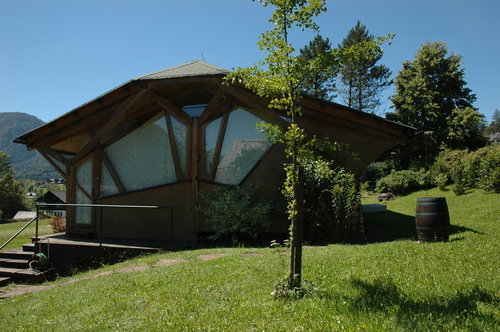 Ein anderes Experiment war die Installierung von Solarkollektoren auf dem Dach für Brauchwasser und einen Heizungsanteil. Diese wurden damals aus Heizkörpern »gebastelt«, allerdings nach einigen Jahren als für ein Ferienhaus unwirtschaftlich wieder entfernt. Doch nicht nur die Energiemaßnahmen hatten Pioniercharakter. Auch die Wahl damals neuer Materialien (französisches billiges Kistensperrholz aus harzreicher Föhre, für die Außenfassade mit Silikon verfugt, grüne Bitumenschindeln auf dem Dach) und Grundriss waren geprägt von Fantasie und Innovationsgeist. Auf die Frage, was er heute anders machen würde, antwortet Konrad Frey: »Konstruktiv betrachtet ist die Holzknotenausbildung zu aufwendig. Es wäre besser gewesen, die schwierige Geometrie ausschließlich im Stahlknoten auszuführen und die Holzprofile rechtwinklig abzuschneiden. Die Holzträger, welche die Außenhaut durchdringen, hätten aus Leimholz sein müssen, denn so geht wegen der durchgehenden Schwindrisse viel Luftwärme verloren. Insgesamt wurden die Holzquerschnitte stärker dimensioniert, als das mit heutigen 3D-Berechnungsmethoden möglich wäre. Die Sperrholzfassade samt den Silikonfugen hat sich – mit mehreren Alkydharzanstrichen über dreißig Jahre – gut bewährt.« Inhaltlich beruft er sich auf die Zufriedenheit der Bauherren, die für die Beurteilung der Qualität des Hauses wohl ausschlaggebend sei, und erzählt, dass er gerade ein Nebengebäude und die Erweiterung eines der Schlafzimmer plant.
