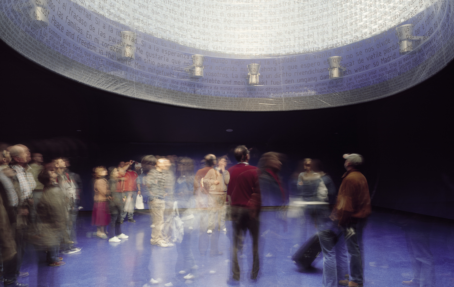 Diese innere Wolke besteht aus einer ETFE-Folie, die durch Überdruck ihre Form erhält und mit einem Befestigungspunkt von den Glasträgern der Decke hängt. Gegen eine Beschriftung mit den Namen der Opfer hatten sich einige Angehörige ausgesprochen. Stattdessen ist auf ihr eine Auswahl der Botschaften zu lesen, die Passanten in vielen Sprachen in den Tagen nach dem Attentat auf Zetteln oder den Bahnhofsmauern hinterlassen hatten. Von der in ihnen zum Ausdruck kommenden kollektiven Trauer und dem Entsetzen wird der Besucher umfangen, wenn er aus dem geschäftigen Treiben der Bahnhofspassage in den 500 Quadratmeter großen, intensiv blauen Gedenkraum tritt und unter dem Lichtkreis der gläsernen Säule steht. Zwei Luftschleusen, je eine als Ein- und eine als Ausgang, sorgen für den konstanten Überdruck in dem fast kapellenhaft anmutenden »Gewölbe«. Hinter der ersten Schleuse sind auf einer hinterleuchteten gläsernen Platte in der Wand die Namen der Opfer eingeschrieben – allerdings nicht aller. Zwei Familien haben die Nennung ihrer Angehörigen untersagt, wollten sich nicht an diesem Ort der öffentlichen Trauer wiederfinden.