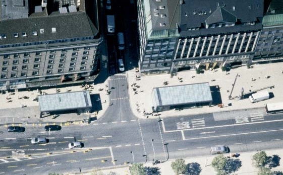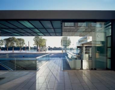 Beide Zugangsbauten bestehen konstruktiv aus rechteckigen, geschweißten Hohlkastenträgern, deren U-Form die Brückenanmutung erzeugt. An diese Stahlbügel sind horizontale Zwischenträger angebracht, die die gläsernen, jeweils oben und unten beziehungsweise innen und außen angebrachten Dach- und Rückwandverkleidungen halten. Diese mit einem abstrakten Tropfenmotiv bedruckten Glasscheiben korrespondieren mit der Glasoberfläche eines ebenfalls von Poitiers entworfenen Restaurantpavillons auf der anderen Straßenseite. Es sind diese durchscheinenden Glasflächen, die einen Großteil des Reizes der Bahnhofseingänge ausmachen: Sie tauchen den halboffenen Innenraum in ein diffuses, blaugrünes Licht mit weichen Schatten; der Bahnhofszugang wird wunderbar als ein indifferentes Niemandsland zwischen Unterwelt und Himmelreich inszeniert. Man befindet sich gleichsam in einer »twilight zone«, einem Zwischenreich, wo das Licht in Schatten übergeht, der offene in den geschlossenen Raum. Auch die in dem Hohlraum zwischen den Scheiben verborgene Beleuchtung streut weich und unterstreicht den nicht fassbaren Charakter des Raumes.