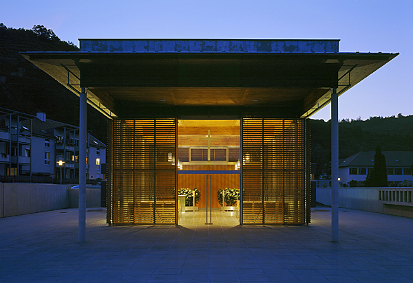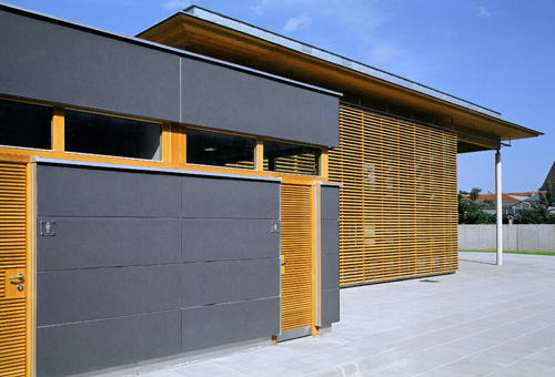 Es wurde ein ruhiger, schlichter Körper als Stahl-Glas-Konstruktion geschaffen. Für den Schutz vor direkter Sonneneinstrahlung sorgt einerseits das weit auskragende Vordach, das gleichzeitig den Zugangsbereich betont, und auch als Witterungsschutz dient, sowie Holzlamellen, die zusätzlich eine gewisse Geborgenheit inszenieren.