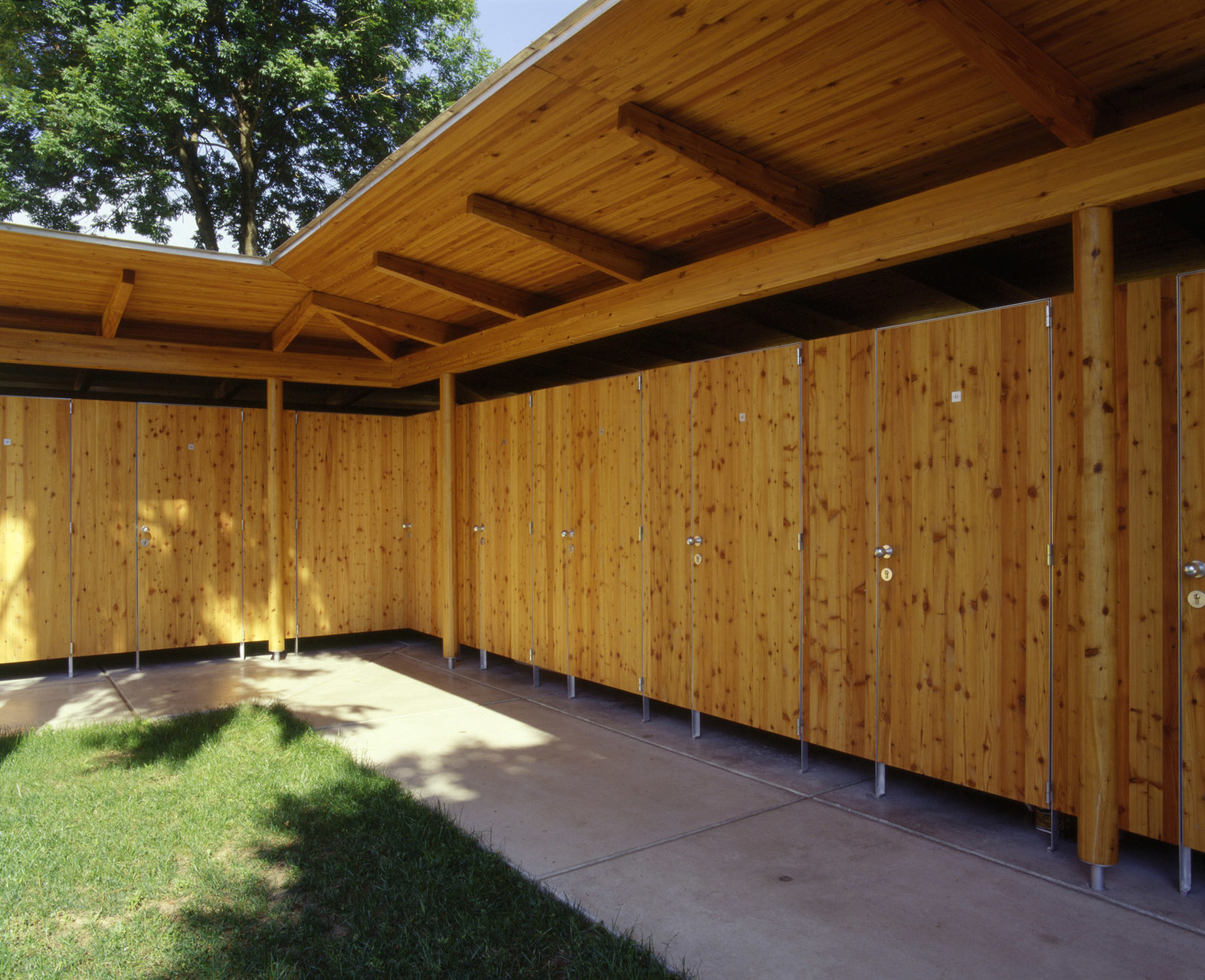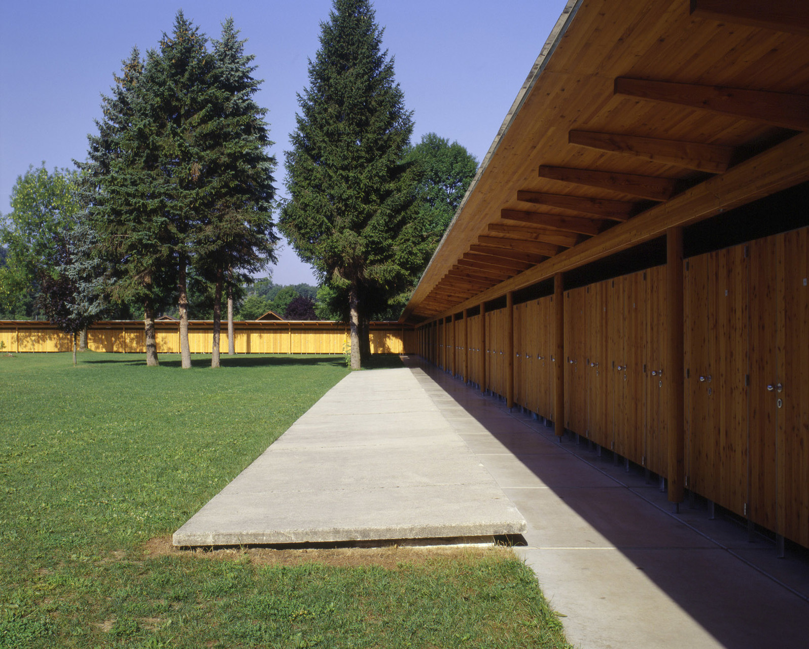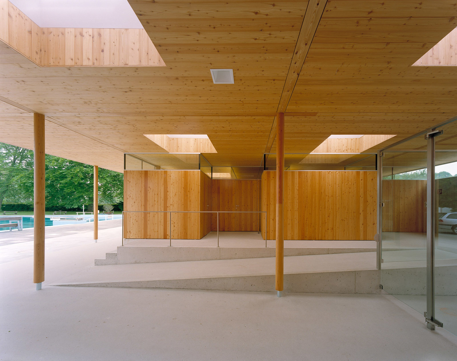 Außerhalb der Saison wird der eigentliche Schwimmschulbereich mittels mobiler Trennwände von der Liegewiese abgetrennt. Diese wird über die Terrasse des Restaurants zugänglich gemacht und dadurch an die Uferpromenade und somit an das öffentliche Wegenetz angebunden. Die Besucher der Sauna nutzen die Becken im Grünraum in der Nebensaison als Kneippbecken. Das Restaurant und die Sportplätze können ganzjährig genutzt werden. (Text: Architekten)