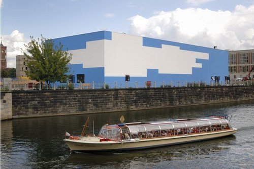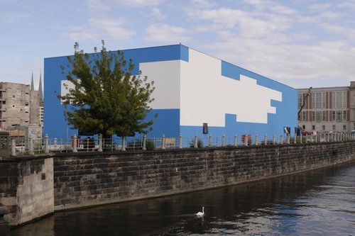 Vom Palast der Republik stehen nur mehr die Stiegenhäuser - und inmitten der offenen Kellergeschoße und Fundamente nun diese blaue Schachtel mit 600 Quadratmeter Ausstellungsfläche und einer Bar (Friedrichs) mit großzügigem Freigelände.