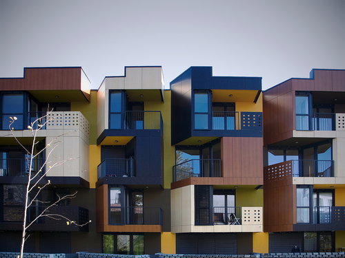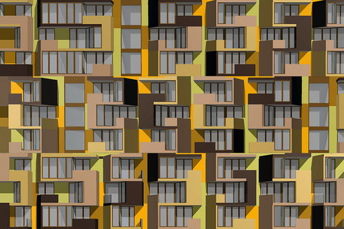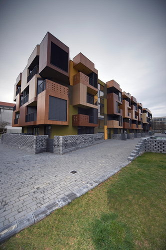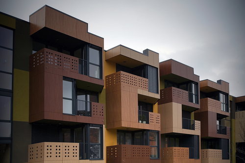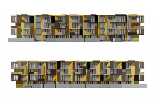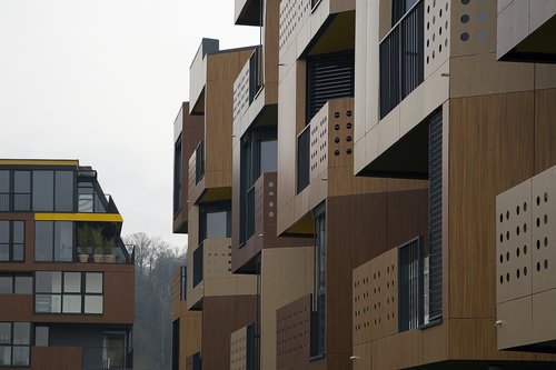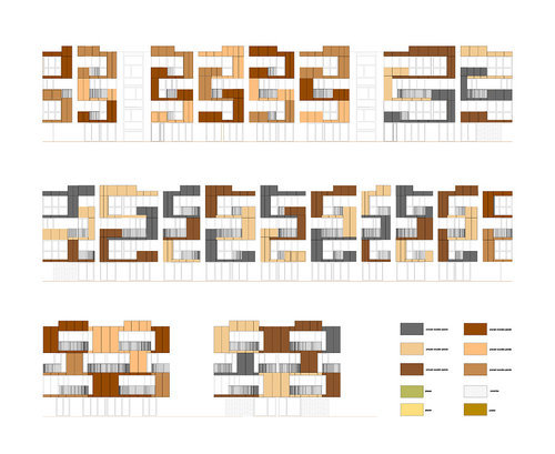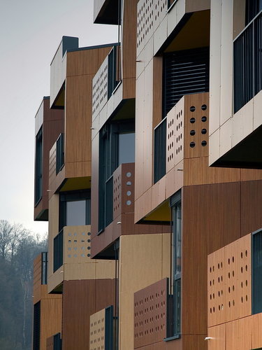 Die Außenfassade der tragenden Struktur trägt Putz, die Loggien sind verglast oder mit Fertigteilpaneelen ausgeführt. Dieselben Paneelen bilden neben transparenten Metallgittern auch die perforierte Balkonbrüstungen und zeichnen durch die drei unterschiedlichen Holzfarben das charakteristische Zick-Zack Muster der Tetris Apartments. (Text: Helga Kusolitsch)
