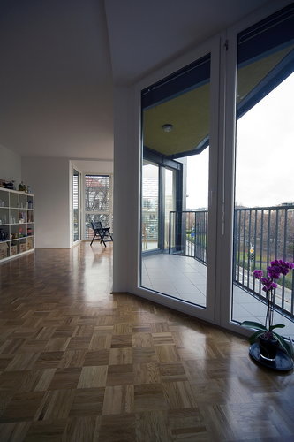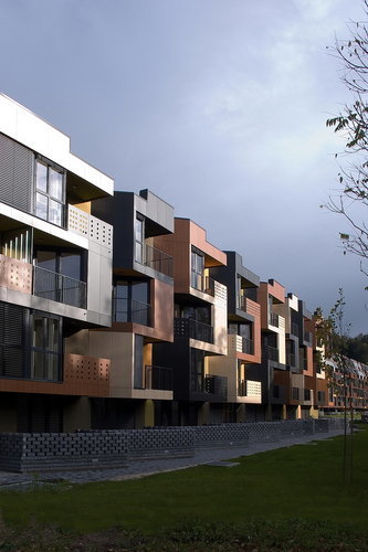 Da sich das viergeschossige Gebäude von 58 m Länge und 15 m Tiefe zur stark befahrenen Autobahn hin orientiert, wurden die Wohnungen selbst mit vorgelagerten Balkonen und 30Grad versetzten Fensterflügeln zur ruhigeren Südseite hin ausgeführt. Auf Ost- und Westseite gibt es keine direkten Fenster, da an diesen Längsseiten der Anlage zwei weitere Wohnblöcke geplant sind. Balkone und Loggien sichern die Intimität, sodass den Nachbarn störende Einblicke verwehrt sind.
