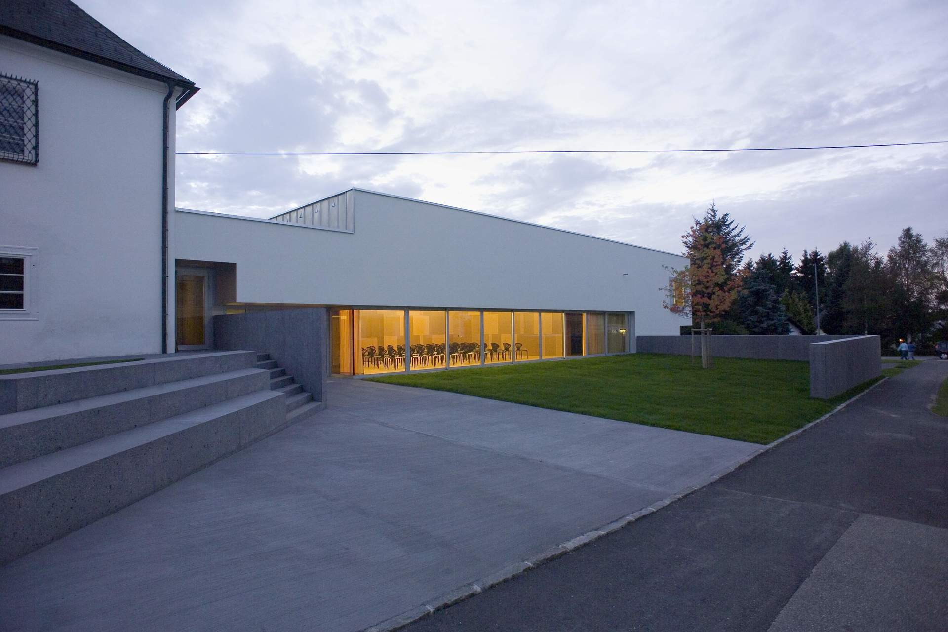 Die Linzer Architekten Klaus Leitner, Peter Pretterhofer und Sonja Simbeni haben sich als Sieger des seitens der katholischen Kirche ausgeschriebenen Architektenwettbewerbes mit einem ebenso einfachen wie wirkungsvollen Gedanken aus den Zwängen frei gespielt, die ein dichter, historisch gewachsener Ortskern dem zeitgenössischen Bauen mitunter auferlegt: sie haben das alte und gänzlich unverdächtige Motiv der Mauer aufgegriffen um die neuen Räume - Innen- oder Außenräume – zu formen, ohne sich dabei auf die im Überfluss vorhandenen Bilder von „Haus“ einzulassen.