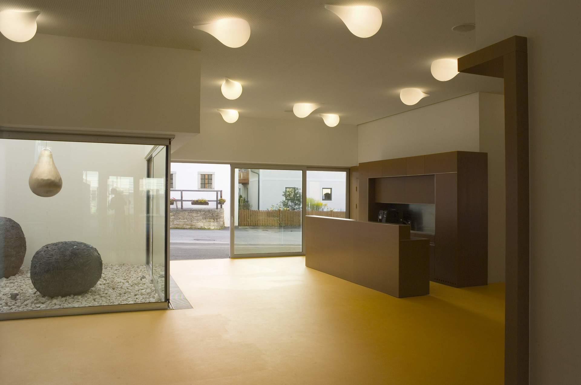 Das alte Pfarrhaus wurde weitgehend auf seine Substanz zurückgeführt. So ist etwa der Eingang wieder an seinem ursprünglichen Platz an der Nordseite des Hauses zu finden und im Zusammenhang mit dem anschließenden Neubau barrierefrei gestaltet. Ein Windfang erschließt nun Pfarrhaus und Pfarrheim und verbindet das etwas erhöhte Erdgeschossniveau des historischen Gebäudes mit dem eben ins Gelände gesetzten Neubau. An den Windfang schließt eine Foyerzone, die über eine großzügige Verglasung die Häuser des Dorfkernes im Westen des Pfarrheimes einbezieht. Ein kleiner, nach außen umfriedeter Gartenhof bringt Licht in die Tiefe des Gebäudes und stellt den nötigen Respektabstand zum Altbau her.