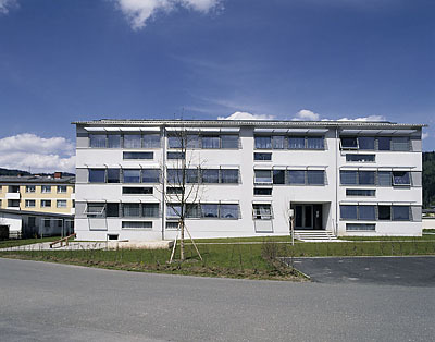 Der Bauabschnitt „Kindberg 2“ umfasst ebenfalls zwei Gebäude. Wie in einer Enklave zwischen den Putzoberflächen der übrigen Häuser unterscheiden sie sich auf den ersten Blick durch die Lärchenholzschalung der beiden oberen Geschosse, die auf einem Sockel mit Eternit-Verkleidung sitzen. Dieser schützt gemeinsam mit dem ausladenden, flach geneigten Satteldach die Holzoberflächen der Fassaden und bildet zusammen mit Mauern, welche die Zonen des Außenraums gliedern eine optische, massive Einheit. Verbindendes Element von Sockel- und Obergeschossen sind die ebenfalls mit Eternittafeln verkleideten Stiegenhäuser, die, seitlich verglast, vor den Fassaden stehen. (Text: Architekten)