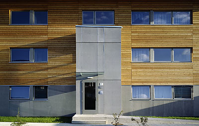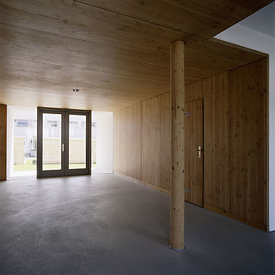 Atmosphärisch sehr speziell gelöst ist die Eingangssituation: Eine verglaste und innen ganz in Holz gehaltene Halle ist zugleich Zugangsbereich, Kinderspielplatz und allgemeine Aufenthaltszone. Sie ist von beiden Seiten begehbar und verleiht dem Gebäude trotz der sehr kompakten Grundrisse für die als Dreispänner angelegten Geschosswohnungen, eine offene, einladende Großzügigkeit.