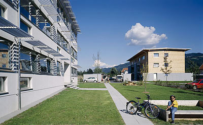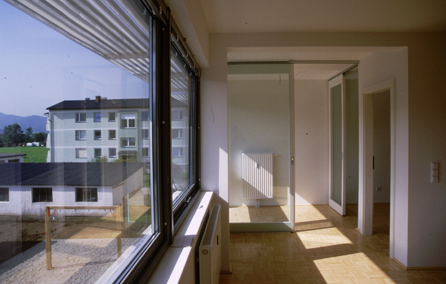 Der erste Bauabschnitt wurde dreigeschossig in Holzleichtbauweise aus vorgefertigten Tafelelementen errichtet und anschließend verputzt. Damit wird einerseits eine Verbindung zu Kubatur und Formensprache der bestehenden Siedlungshäuser hergestellt, andererseits kommen die bautechnischen und -physikalischen Vorteile der Holzbauweise – kurze Bauzeit und günstige Energiebilanz – zum Tragen. Die Strenge der klaren, massiv erscheinenden Baukörper wird durch Fensterbänder, bzw. bündig in die Fassade eingeschnittene Loggien relativiert. Letztere sind verglast und beheizbar und können daher auch im Winter als vollwertige Wohnräume genutzt werden. Für ausreichende Beschattung sorgen vorgesetzte Lamellen an der Fassade und innen liegende Jalousien.