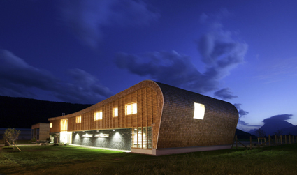 Der leichte, durchscheinende, filigrane Holzkörper des Obergeschosses sitzt auf einem Sockel aus schiefergrünen Serpentinit - Steingabionen auf – durchdrungen nur vom Glasportal, welches den Blick auf das Biotop freigibt, dessen Wellenbewegung sich in der Abendsonne an den naturbelassenen Sichtbeton-Wänden des Foyers widerspiegelt.