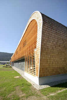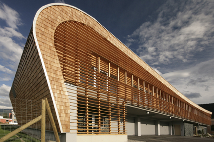 Das geschwungene mit Holzschindeln gedeckte Dach des Bürokomplexes versinnbildlicht schon von weitem die „Welle“ als architektonisches Markenzeichen und Symbol für Fortschritt und Zukunftsorientierung. (Text: Architekten)