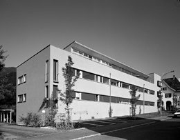 Den Hangverlauf nützend, sind die Stellplätze mit Zufahrt vom Norden ebenerdig unter die Wohnungen eingeschoben. Die überdachte Außentreppe mit breitem Laubengang bildet das räumlich ansprechende, offene Gelenk, das die im Winkel hier aneinanderstoßenden Trakte bzw. Hof- und Straßenbereich verbindet. (Text: Otto Kapfinger in „Baukunst in Vorarlberg seit 1980, Hrsg. VAI / KUB“)
