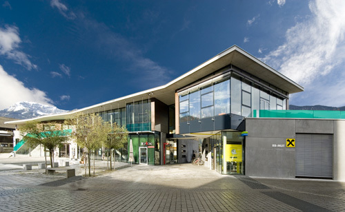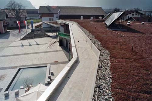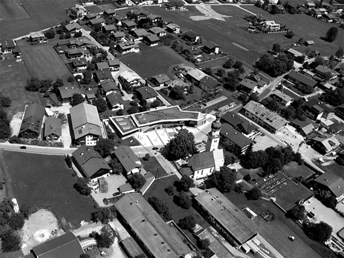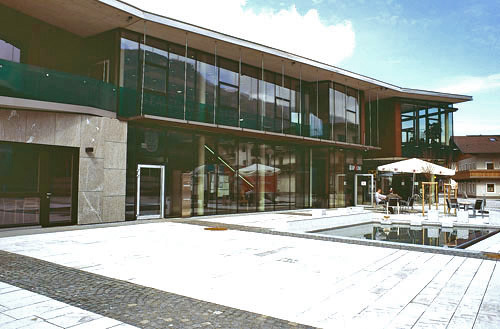 In der zum Platz hin verglasten Erschließungshalle ist erdgeschossig das Bürgerservice untergebracht, von hier aus sind auch die Altenstube und das Café erschlossen. Durch Öffnen der Schiebetüren kann die Halle um die Altenstube erweitert werden und bietet damit eine große zusammenhängende Fläche für Ausstellungen oder öffentliche Veranstaltungen. Der offene Bereich im Obergeschoss – mit Blick über den Platz zur Kirche – ist Wartezone, Foyer und Teeküche für die Gemeinde, zusätzlich wird die Arztpraxis von dieser Ebene erschlossen. Vom Foyer aus gelangt man über einen verglasten Steg zum Sitzungssaal, der als Solitär auf dem kubischen Bankbaukörper positioniert ist. Eine leicht erhöhte Festterrasse bildet mit der umgebenden Grünfläche die Festwiese. Vereinsfeste, wöchentlicher Bauernmarkt, Weihnachtsmarkt, Flohmarkt machen diesen Ort lebendig, der durch die Überdachung von Bühne und Festterrasse ganzjährige genutzt werden kann.