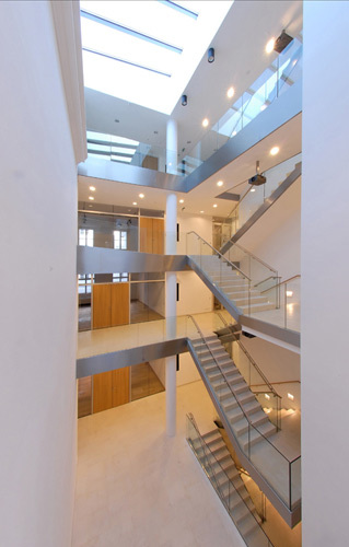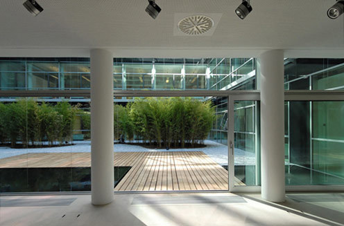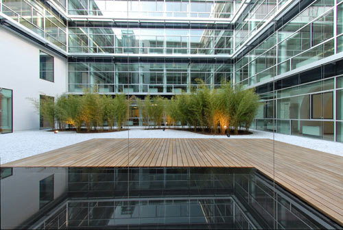 Gerade die glatte Putzfassade des Palais Palffy mit der horizontalen Gliederung ohne Pilaster oder Lisenen, den rein additiv gesetzten Fensteröffnungen ohne Risalite und dem leichten Knick in der Fassade, der eine perspektivische Spannung evoziert, zeugt von einer Modernität, auf die sich Architekten heutzutage anstandslos beziehen können. Während die Straßenseite unverändert blieb, wurde der frei geräumte Hof an drei Seiten mit einer Glasfassade mit feiner Alu-Profilierung umschlossen, um die dahinterliegenden Büros möglichst gut zu belichten. Der Hof mit seinem gekiesten Boden, einer Holzterrasse, einem Wasserbecken und Bambusstauden wird so seiner historischen Aufgabe als Patio des Stadtpalais gerecht: Reduziertgestaltet, dient er als ruhiger (Außen-)Raum zur auch visuellen Kommunikation.