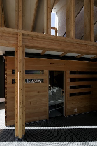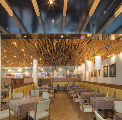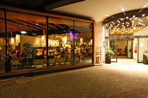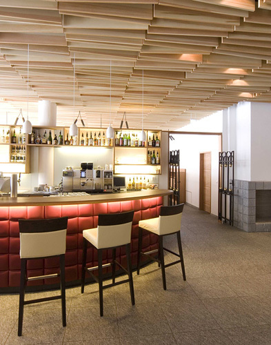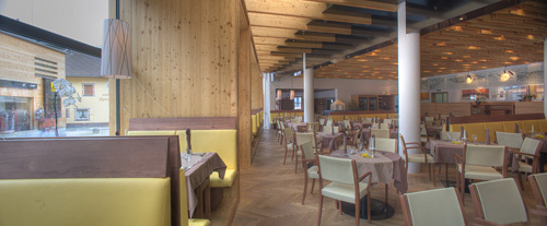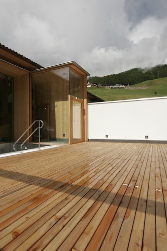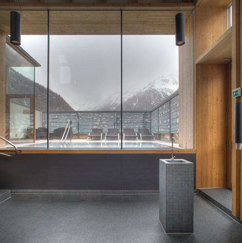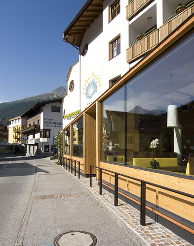 Die Umgestaltung der Wellnessanlage im Dachgeschoss war 2007 der erste zeitgenössische Eingriff durch M9 Architekten an dem im Zentrum von Sölden gelegenen Großhotel „Liebe Sonne“. Der vorher nahezu geschlossene Dachraum wurde dabei nach allen Seiten geöffnet und die bevorzugte Lage dieser Erholungsetage im 4. und 5. Obergeschoss mit Ausblick auf die Ötztaler Bergwelt entsprechend genutzt. Ein zweigeschossiger Umgang bietet Ein- und Durchblicke in alle Räume, die gleich wie die Freibereiche vorwiegend in unbehandeltem bzw. geöltem Lärchenholz in Kombination mit dunklem Glasmosaik gestaltet sind. Eine vorgelagerte Terrasse mit Whirlpool und die unmittelbar erlebbare Naturlandschaft verleihen dem Erholungsbereich seine Großzügigkeit.Ein Jahr später wurde die gesamte Erdgeschosszone mit Hotelhalle, Bar, Rezeption, Restaurant und Buffetraum wiederum durch M9 Architekten umgestaltet. Nach außen sind die baulichen Eingriffe in erster Linie durch die Neugestaltung des Eingangsbereichs und den zur Straße hin erweiterten Wintergarten spürbar. Große Fensterflächen und ein verglastes Oberlicht bringen viel Licht in die Tiefe des Raumes und vermitteln dem Gast die offene und angenehme Atmosphäre des Hauses. Im Inneren dominiert wie schon beim Sauna-Umbau eine schlichte, elegante Formensprache mit natürlichen Materialien: ein in allen Räumen durchlaufender Steinboden, im Speisesaal ein geölter Eichenholzstabparkett, lederbezogene Sitzbänke und Stühle. Die Lärchenholzlamellendecke verbindet die Hotelhalle mit dem Speisesaal und bringt eine verspielte Note in die Räume. Möbel, Bar und Rezeption sind zurückhalten in Leder und Rüsterholz gestaltet. Bilder des Tiroler Künstlers Maurizio Bonato illustrieren im Buffetraum, Speisesaal und Hotelhalle die Familiengeschichte der Hoteliersfamilie Gurschler und die Schönheit der Ötztaler Bergwelt. (Text: Claudia Wedekind nach einem Text der Architekten)
