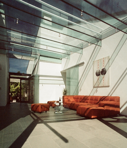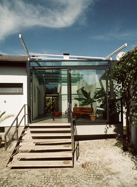 Der Besucher wird vorbei an der 2,5 Meter auskragenden Vitrine, die im Gebäude zur Garderobe wird, in das verglaste Atrium geführt, das sich auf einer Betonplatte in den Hof erstreckt und von zwei Glasschiebeelementen vom Privatbereich getrennt ist. Das Glasdach des Atriums liegt auf Glasschwertern und wird bei Bedarf von einem Sonnensegel abgeschattet. Von dort gelangt man über eine breite Treppe zum neuen Verkostraum am Ende des Hofes.