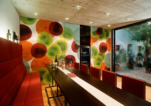 Die Verkostung mit 25 m² öffnet sich mittels Glasschiebeelement zum Hof. In dessen Inneren trennt eine Kunstwand den Gastraum von einem Wirtschaftsraum und einem Büro.