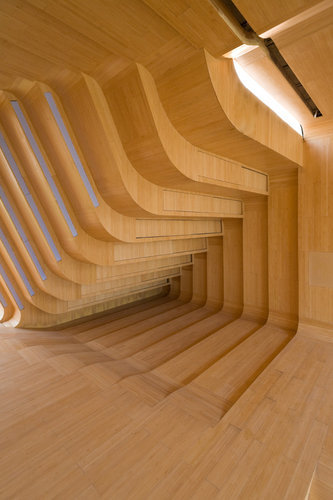 Der virtuelle Raum der 2 Projektionstrichter determiniert den physischen Raum. Dieser entsteht aus der linearen Abfolge von 20 Rahmen. Die Raumquerschnitte variieren von Achse zu Achse durch die fortlaufenden Topographien in Wand, Boden und Decke. Jeder Rahmen ist einmalig, dennoch entspringen alle topologisch einer Familie. Gemeinsam formen sie eine gestufte Landschaft und integrieren Oberfläche, Konstruktion und Programm in einer Struktur. Die kontinuierliche Raumoberfläche wird dadurch in eine ergonomische und operative Landschaft transformiert, die zwischen unterschiedlichen Raumzonen differenziert. Die Primärkonstruktion dieser Landschaft ist Stahlbeton. Sie schließt nach außen hin mit Zentimeter-großen Edelstahl-Quadratkacheln ab, während dagegen die Innenoberfläche aus Bambus-Sperrholz gestaltet ist. Sie nimmt zugleich Sitzgelegenheiten, mediale Oberflächen, Stauraum, Lautsprecher und Beleuchtung auf und macht somit eine zusätzliche Möblierung des Raumes überflüssig. Der so entstehende polyvalente Raum dient nicht nur dem multimedialen Raumprogramm, sondern ermöglicht zugleich einen Ort der Versammlung und Ruhe inmitten des Parks, an dem sich virtuelle und physische Räume überlagern. (nach einem Text des Architekten)