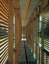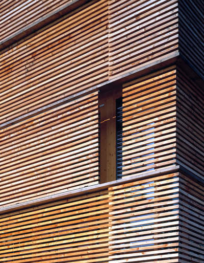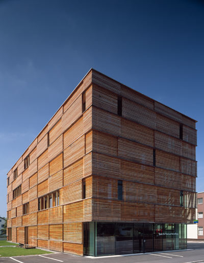 Architekturinteressierte haben in Vorarlberg eine neue Pilgerstätte: die jüngste Filiale der Bank für Tirol und Vorarlberg, in Szene gesetzt von Baumschlager / Eberle. Das Bank-, Büro- und Wohnhaus im Zentrum der 8000-Einwohner-Gemeinde Wolfurt polarisiert. Blickfang des Holz-Glaskubus ist die Fassade. Elemente aus unbehandelten Lärchenleisten, verschiebbar (sofern man die nötige Körperkraft aufbringt und schmutzige Hände nicht scheut) garantieren im Bankenbereich Diskretion, sind Sichtschutz und Schattenspender für Büros und die acht Eigentumswohnungen. Nicht allein die für eine Bank ungewohnt transparente und schlichte Holz-Glasfassade unterscheidet die BTV Wolfurt von anderen Geldinstituten.