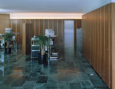 Dazu stehen ein Service-und ein auf das Notwendigste reduzierter Beratungsbereich zur Verfügung. Fast 45 Prozent der Transaktionen werden von den Kundinnen und Kunden selbst an den Computern durchgeführt. Der Servicebereich mit SB-Computern ist von 5 bis 22 Uhr geöffnet. Die „Automaten“ spielen alle Stückerl, geben Auskunft über Konditionen und erledigen sogar Terminüberweisungen. Schutz vor neugierigen Blicken gewähren im transparenten Servicebereich Computereinhausungen aus Nußfurnier, eine Oberfläche, die Baumschlager / Eberle im gesamten Kunden- und Bürotrakt einsetzen. Der Beratungsbereich ist außerhalb der Öffnungszeiten lediglich durch eine Glaswand vom Servicebereich getrennt. Wer sich nicht selbst an Computern bedienen will, wird von freundlichen MitarbeiterInnen an einen Beratungsplatz, die aus Computer-Stehtischchen und Rollboys bestehen, gebeten. In der „Beziehungsbank“ stehen die Kunden im Mittelpunkt. Dies durchaus wörtlich. Das Bild, das sich erstaunten ErstbesucherInnen in der BTV-Service-Bank bietet, ist ein ungewohntes: Personengruppen an Stehtischen, in Gespräche mit den BeraterInnen vertieft, statt der Espressi Computer vor sich. Quietschende Kinder vor dem Sparautomaten McRich, dazwischen immer in Bewegung: das vierköpfige Beratungsteam. Der Geräuschpegel im Service- und Beratungsraum läßt keine Erinnerung an ehrfürchtige Stille in protzigen Marmortempeln hochkommen. Besprechungszimmer im Erdgeschoß und im Bürotrakt, schlicht in Chrom, Kunststoff und Nuß möbliert, ergänzen das Angebot durch Rückzugsmöglichkeiten.