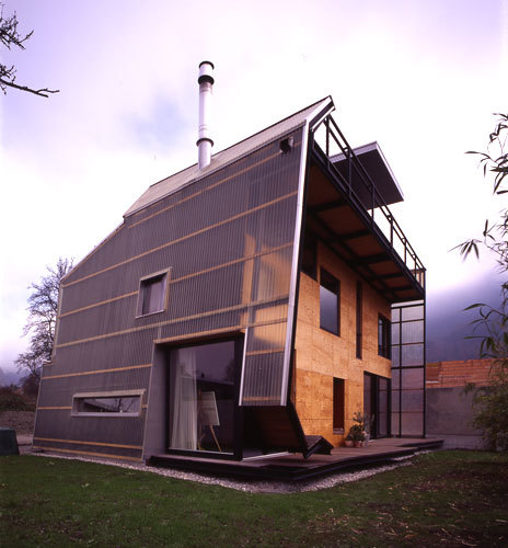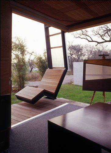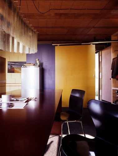 Diese Aspekte waren Grundlage für dieses Doppelhaus - Wohnmöbel. Wohnmöbel deshalb, weil Sitzgelegenheiten Teil des Hauses sind, eine Art dienende Gliedmassen, Bestandteile aus dem Ganzen. Die knappen finanziellen Mittel wurden so eingesetzt, dass die räumliche Qualität und die Primärgewerke zur Hauptsache wurden, die Sekundärgewerke wurden auf ein Minimum beschränkt. Das Notwendige ist vorhanden, doch spartanisch. Oberflächenveredelung gibt es keine – nur Farben dienen zur visionären Gestaltung. Im Erdgeschoss sind Küche und Essen, Diele und WC untergebracht. Die südwestliche Ecke kann mittels Schiebetür und Drehtüre (dort wo die hängende Liege situiert ist) komplett geöffnet werden. Diese Möglichkeit ersetzt die Pergola, man fühlt sich im Innenraum im Außenraum. Der aufgeklappte, übergroße Drehflügel dient als Windschutz. Das zweieinhalb Geschoss hohe Regal ist gleichzeitig Stiege und Stauraum der Heiztechnik, Elektroverteiler, Kleider, Bücher, Bar etc. Im Obergeschoss befindet sich der Schlafbereich, Wohnbereich und das Bad mit WC. Durch den verschiebbaren Hängeschrank und Vorhang, lässt sich der Raum so konzipieren, dass jede Funktion als Raum für sich stehen kann oder als Einraum. Die Überlappung der Funktionen lässt eine unerwartete Großzügigkeit zu, man schläft in einem 30m² großen Schlafzimmer, man badet in einem 30m² großen Badezimmer und wohnt auch in einem 30m² großen Wohnzimmer, obwohl die Geschoßfläche nur ca. 35m² beträgt. Der offene Kamin, die HIFI-Anlage, die gezielt auf die Außenwelt ausgerichteten Fenster und die Plexiglaskuppel über dem Bett sind ebenfalls wichtige Gliedmassen des Hauses. Das OG ist durch eine Falltüre (Klappe) vom EG trennbar – sie verschließt die Treppe horizontal.
