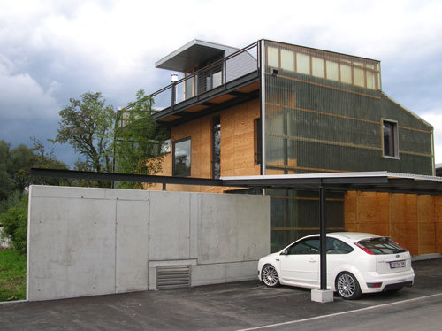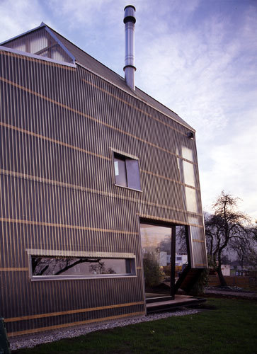 Warum das Haus entstanden ist: Ursprünglich hat mich das Beobachten der traurigen Wohnbauszene dazu veranlasst, mir Gedanken über eine Antwort auf die gängigen Wohnklischees zu machen. Nachdem sich zwischenzeitlich auch meine Wohnverhältnisse verschlechtert hatten, die Mieten zum Gebotenen sehr hoch sind, ging ich konkret an die Realisierung. Also war vorerst die Frage zu beantworten, wie ich zu einem Grundstück komme, - Grundlage für eine realistische Planung. Mit einem befreundeten Baumeister fand ich einen von der Idee Begeisterten und somit auch ein kleines Grundstück (315 m²), Rest einer groß angelegten, verdichteten Wohnsiedlung herkömmlicher Art. Trotz des kleinen Grundstückes musste es mindestens ein Doppelhaus sein, um Kosten zu sparen.