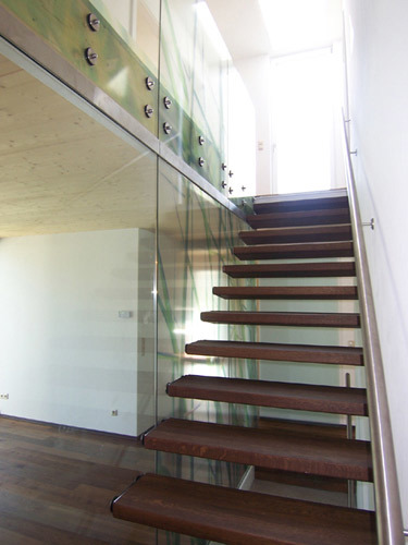 Bei Haus B ist dieser Screen als bedruckte, vorgesetzte Glasfassade ausgebildet; der den Zimmern vorgelagerte Freiraum ist hier als Loggia nach innen gestülpt. Der massive Lärchenholzrahmen, der bei Haus A Balkon und Pergola trägt, wird bei Haus B durch einen vertikalen und einen horizontalen Stahlrahmen interpretiert, zwischen die das mobile Sonnendach gespannt ist. Das Motiv des bedruckten Glases wird im Innenraum variiert – einmal als Glaswand, in die die Trittstufen der Treppe in den 1. Stock eingespannt sind, einmal als Trenn- und Duschwand im Bad.