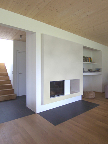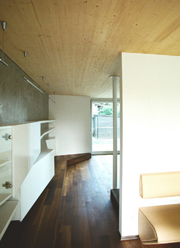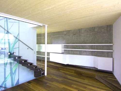Die Materialien und Baustoffe sind in ihrer Optik und Haptik wesentliche Mittel der Gestaltung der Räume – die kalte Sichtbetonwand der Feuermauer steht im direkten Dialog mit der warmen Sichtholzdecke, die Lärchenholzfassade, deren lebendige Oberfläche durch das Schattenspiel bewusst verstärkt wird, kontrastiert mit der perfekten, glatten Glasfassade. Die Atmosphäre beider Häuser lebt zu einem guten Teil vom Wechselspiel der eingesetzten Materialien und Konstruktionen. (Text: p!² architektur)