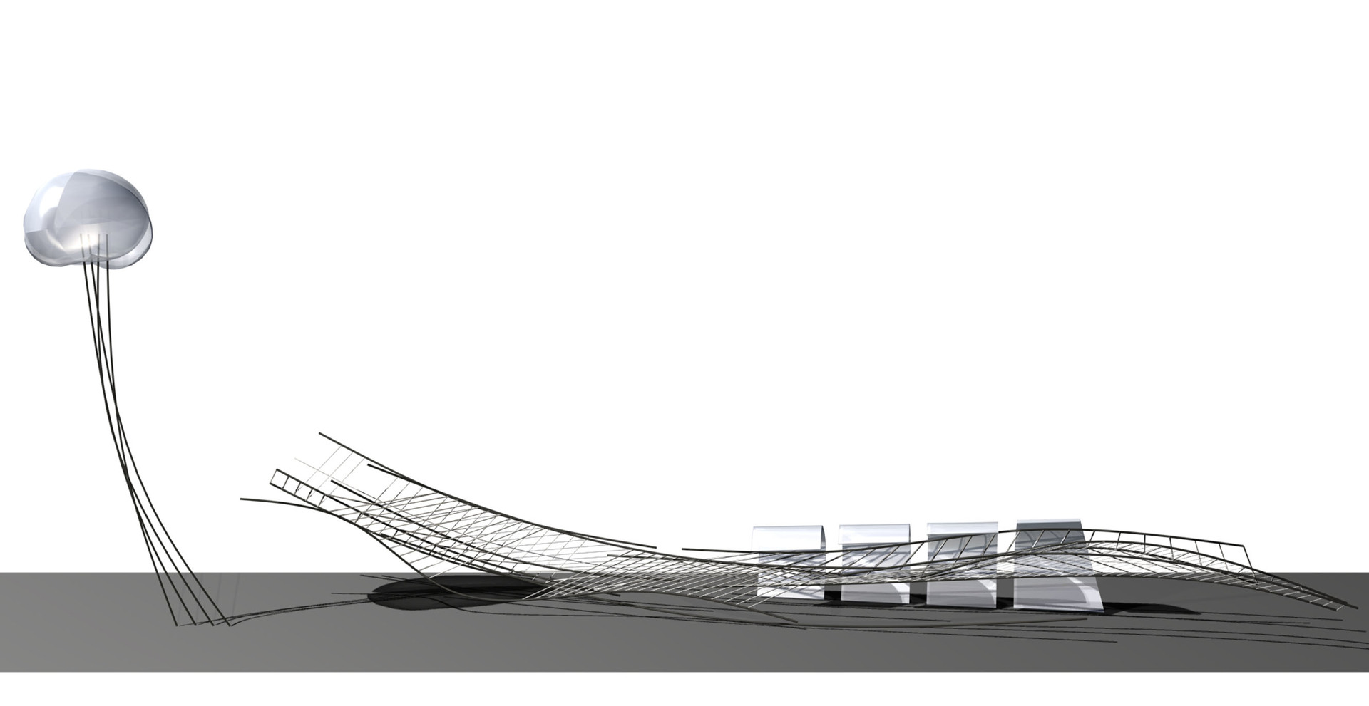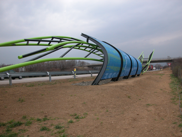 „The Thing & The Wing“ der Gruppe ORTLOS architects, eine zweiteilige Installation aus Stahl und durchscheinenden polymorphen Flächen, dynamisiert die von Slowenien kommende Autobahneinfahrt. Das aerodynamische Gebilde „The Wing“ – auf narrative Deutlichkeit wird verzichtet – besteht aus mehreren horizontal ausgerichteten Layern, die man durch die Fahrtgeschwindigkeit nur abstrakt wahrnimmt. „The Thing“ hingegen wird wie ein künstlicher Mond schon aus großer Ferne wahrgenommen und verweist auf die Landmarke des Grazer Uhrturms. Erst im Vorbeifahren, in der Bewegung von Raum und Zeit, verbinden sich die beiden komplementären Objekte zu einer polymorphen Installation. (Text: Gabriele Kaiser)
