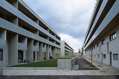 Einst herrschte auf dem fast 10.000 Quadratmeter großen Areal in der Donaustadt militärischer Drill. Lange Zeit stand hier die Carl-Kaserne und hielt sich diszipliniert an den Blockrand. 2004 schrieben die beiden Wohnbauträger Arwag und Gewog einen Bauträgerwettbewerb aus, der die Weichen für eine Zukunft mit gefördertem Wohnbau stellte.