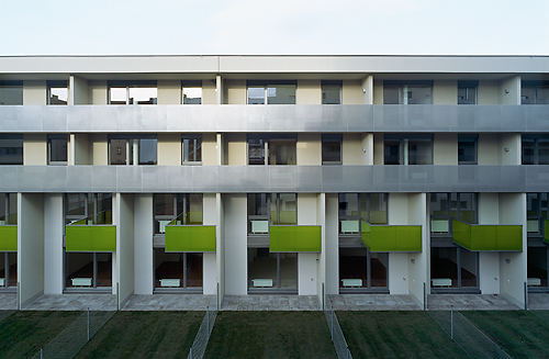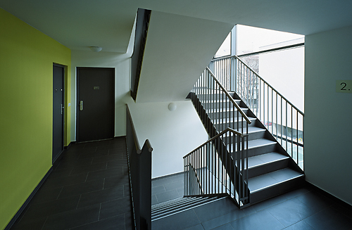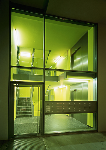 An den Enden sind den viergeschoßigen Wohnriegeln würfelförmige Kopfbauten vorgelagert. Hier liegen die Stiegenhäuser. Orange und gelb strahlen die Wände und Decken des Foyers durch die Glasscheiben. „Die Kopfbauten sind die Gesichter der Wohnanlage“, so Zacek.