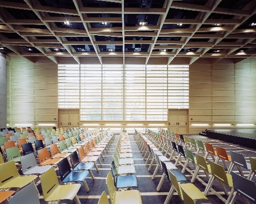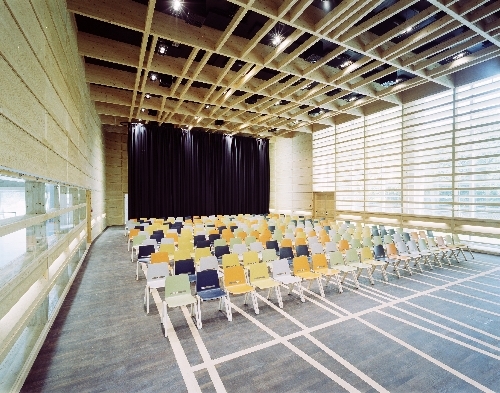 Der Mehrzwecksaal ist das Herzstück des Stadteilzentrums „centrum.odorf“. Als Veranstaltungsort für vielfältige lokale Aktivitäten wie Feste, Bälle oder Schulveranstaltungen, aber auch über den Stadtteil hinausgehende kulturelle Nutzungen, soll er zu einem Ort der Identifikation für die Bewohner des Olympischen Dorfs werden.An der geschlossenen Ecke des Platzes gelegen, bietet eine 40 m lange Glasfront zum Platz und entlang eines Durchgangs Einblick in das Foyer. Der Saal selbst ist eine Holzskelettkonstruktion aus Fichtenleimholz, die nach dem Raum-im-Raum Prinzip frei in der 10 m hohen Sichtbeton-Halle aufgestellt ist – die gekrümmte Form der Wände betont diese Autonomie. Mit einer lichten Höhe von 7 m und den Abmessungen von ca. 27x13 m bietet er Platz für 300 Personen.